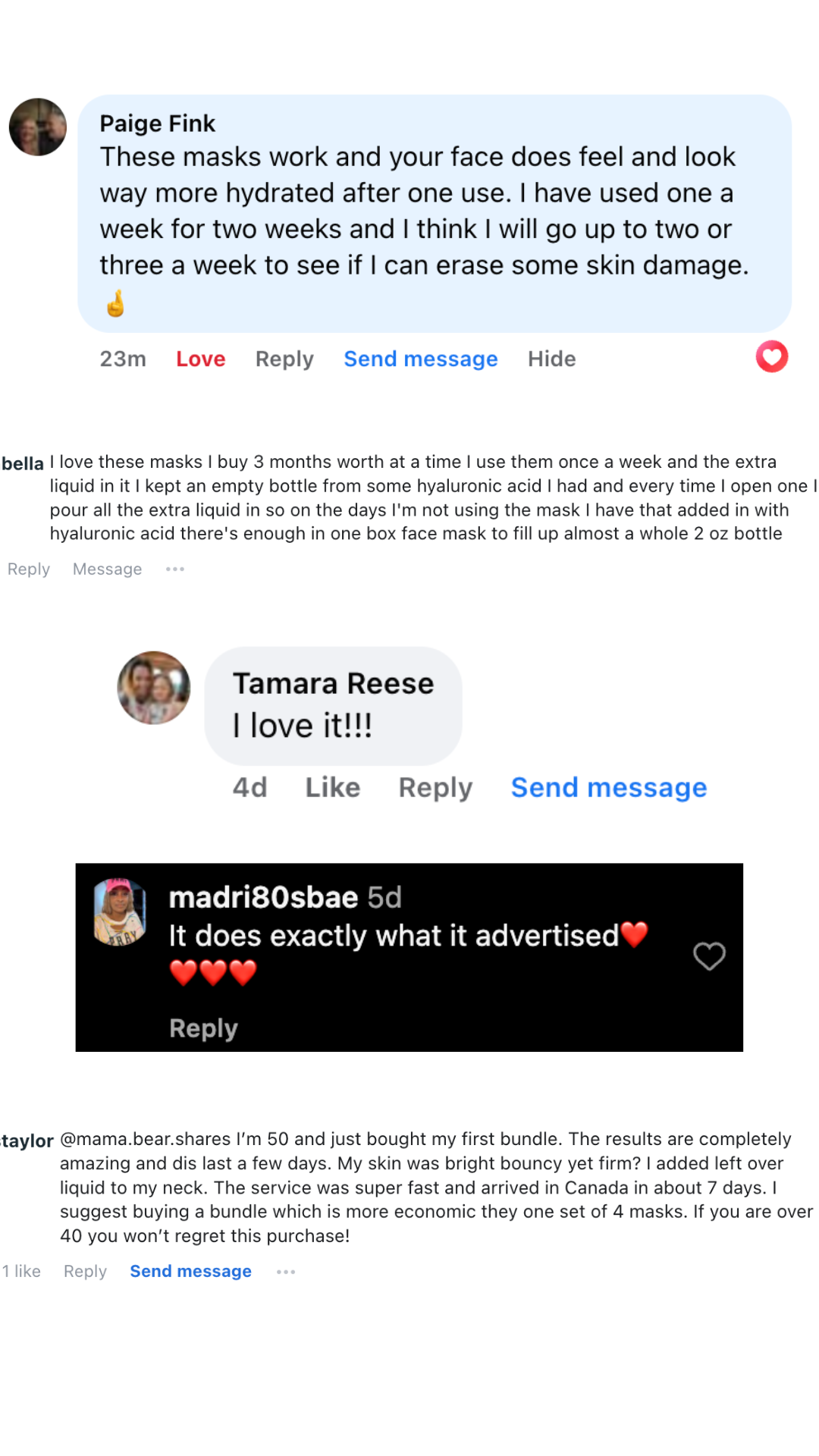 Everything. We use 3x more collagen, a two-piece custom-fit design, and a low-molecular blend of peptides and hydration complexes for visible results — fast. No stickiness, no gimmicks. Just real glow.